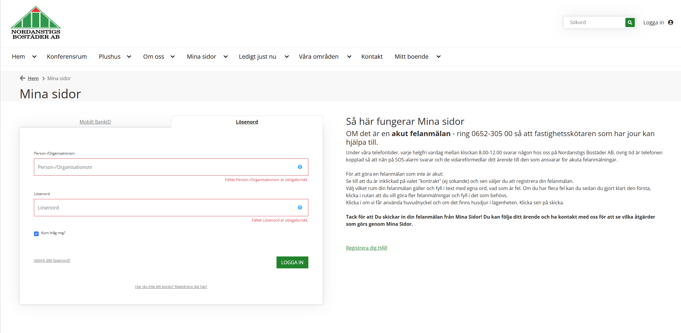 Felanmälan via "Mina sidor" kan göras dygnet runt. Inloggning via BankID eller användarnamn och lösenord.